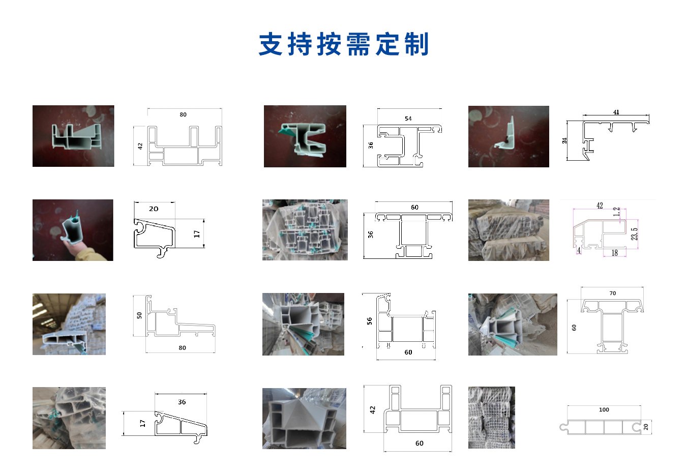 PVC異型材模具:PVC塑鋼門窗、平開(kāi)門窗、推拉門窗、護(hù)欄、線槽等。